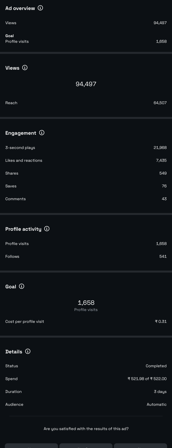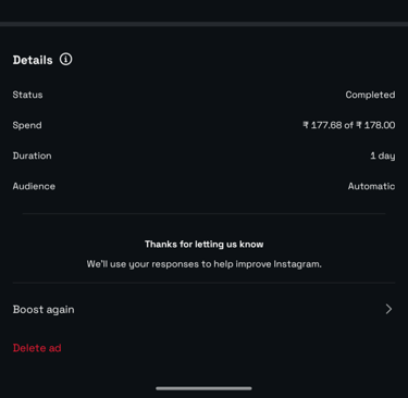 As visible in the individual campaign screenshots, promotions were run with budgets between ₹178 and ₹521. This range enabled efficient testing while limiting risk and maintaining tight feedback cycles on performance.