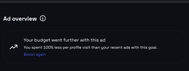 In this campaign, the platform itself displayed a system notification indicating that the cost per profile visit had decreased by 100% compared to similar ads.