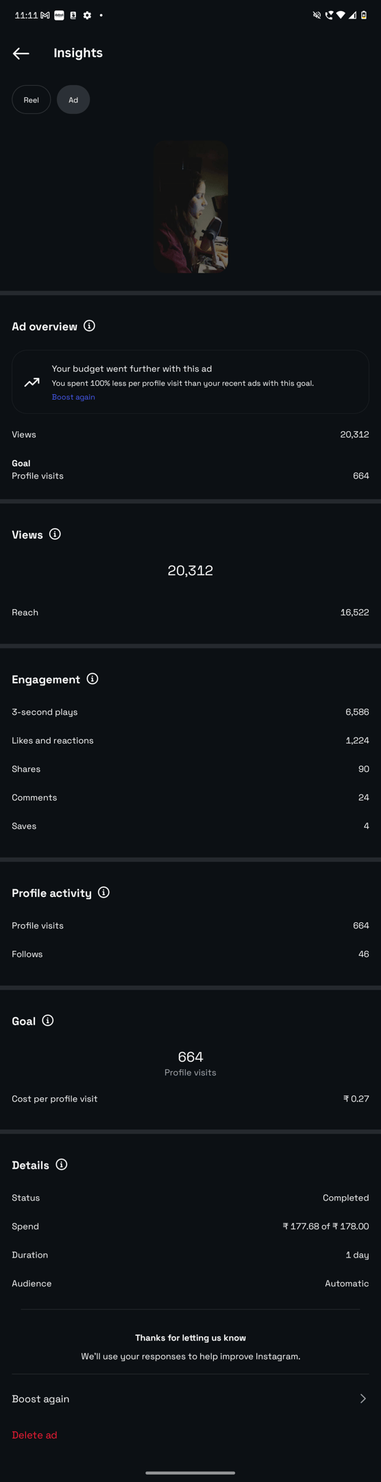 (Based on actual analytics from Instagram. Screenshots of the Insights dashboard and individual ad performance have been attached.)